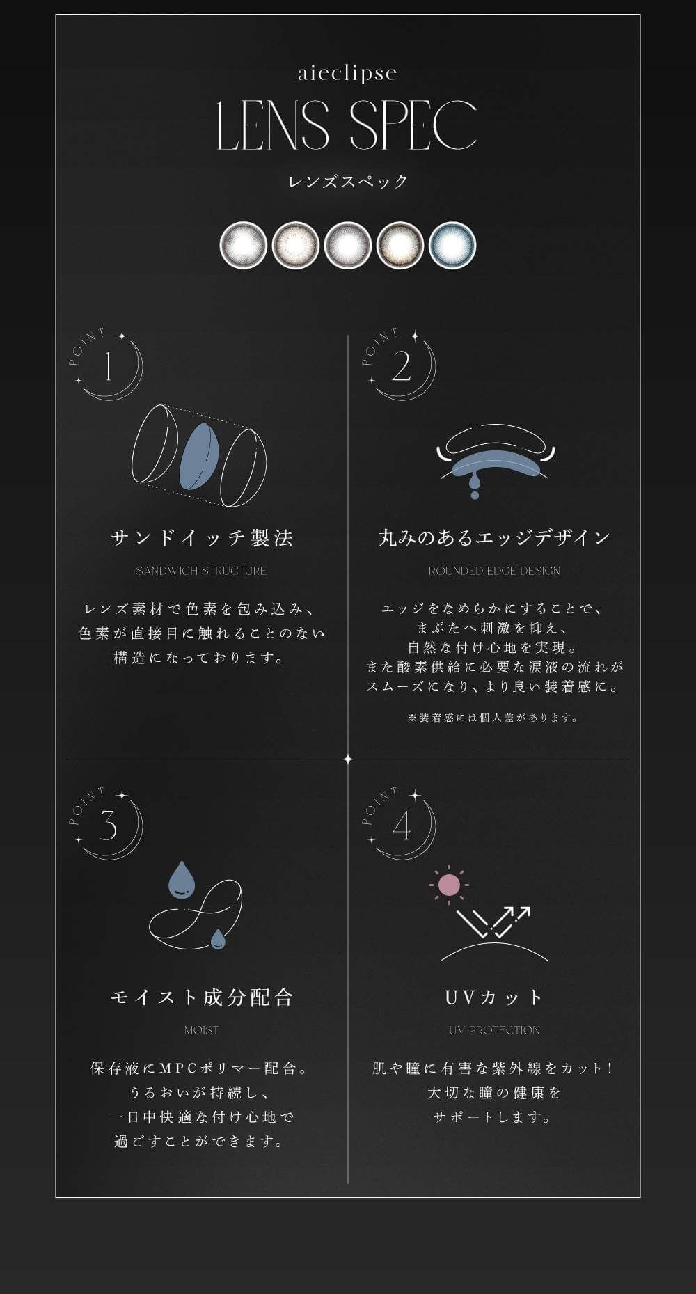 インフルエンサーの石川愛さんプロデュースカラコン『aieclipse(アイエクリプス) 』待望の回らない水光カラコン登場!!透明感と輝きを瞳にまとうがコンセプト。ハイライトが入った『水光』デザインで美しい瞳に 《ライトムーン》【NEW】3方向のハイライトで瞳を立体的かつ美しく魅せるライトグレーレンズ《サターン》大人っぽい綺麗なベージュで美しい瞳に。派手すぎず黒目でも沈まずに自然に盛れる発色とこだわりのデザイン《グレムーン》水光感を引き出すダークグレー。 太さの異なるフチを合わせて自然に盛れるデザインに 《ブルムーン》今までにない絶妙発色ブルーが派手になりすぎず、気高く美しいクールな目元に 《ブラムーン》ベージュブラウンのハイライトがうるっと自然に発色。 綺麗で大人な印象とちゅるんと可愛い印象どちらも兼ね備えてる最強レンズ。 モデル:石川 愛