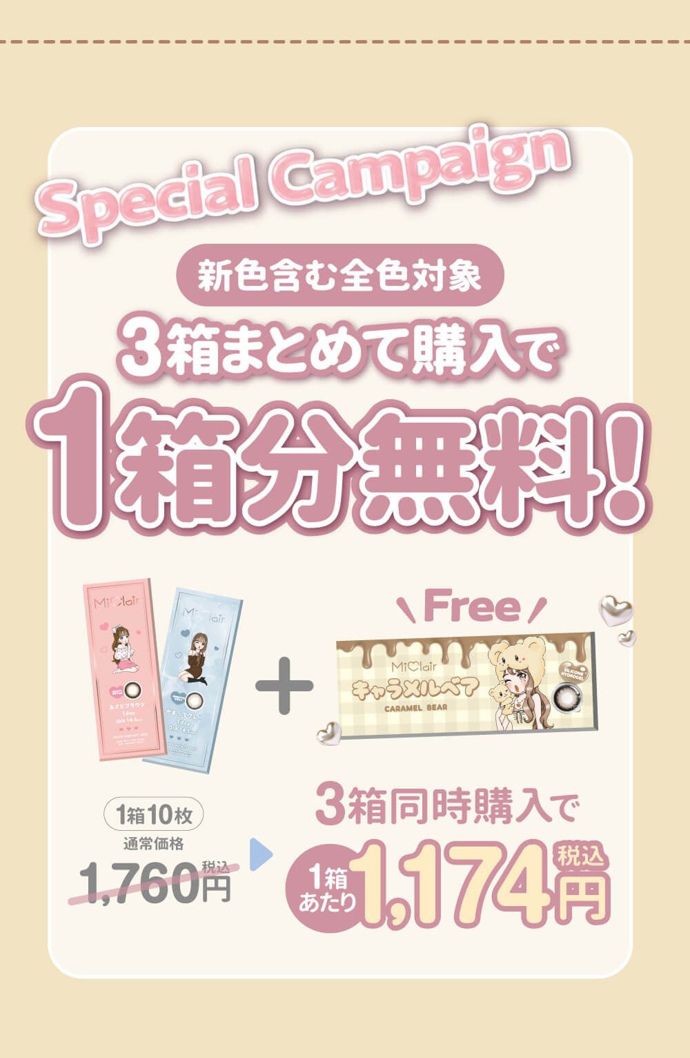 伊藤桃々(いとうもも)ちゃんプロデュース『MiClair』からシリコンレンズ登場! どんなシーンもいちばん似合う私に。 好みやシーンに合わせて選べるわがままな13カラー♡ 《キャラメルベア》【NEW】キャラメルのような甘さたっぷりの明るめブラウン。黒目さんでもしっかり発色してくれます♡ 《ピーチグレージュ》【NEW】ありそうでなかったくすみピンク×グレージュで大人っぽい目元に! 《しらんぷりグレー》【NEW】使いやすい甘さ控えめグレー♡ じゅわっとぼかしフチで瞳に自然に馴染みナチュラルな仕上がりに。 《なまいきブラック》あざとブラウンの色違い誕生!!くりくりした子猫のような瞳に《クルムグレー》白っぽグレーの水光デザインレンズ。つけた瞬間儚げ美少女の瞳に《かまってグレー》太すぎず細すぎない絶妙なサイズのフチだから派手になりすぎず盛れる!! ほんのり甘さをまとったグレーが美しく発色してクールな目元に。《パンプキンブラウン》 オレンジブラウン×じんわり染まる太フチでくりくりeye 黒目の色素を自然にトーンアップしちゅるんとした上品な瞳を演出 《わがままピンク》ちゅるんとした抑えめで甘さを引き立てながら瞳に自然に馴染むピンクカラコン 《ドールブラウン》小粒目さんでもしっかりサイズアップできる黒フチ×高発色ブラウン。 誰でもお人形さんみたいにくりっと可愛くなれる 《あざとブラウン》 太めフチ×ダークブラウンとベージュブラウンのきゅるん発色。 しっかり盛れて、あざとく可愛い女の子らしさの詰まった瞳 《すっぴんブラウン》 ぼかし黒フチと少し明るめブラウンが、自然なツヤっぽい瞳を演出。 ナチュラルだけど盛れる彼ウケ無敵の発色。