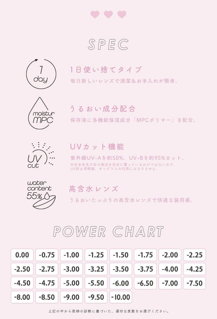 ブラウンベースだからいつでも使えてナチュラルに盛れる♪ レンズデザインもこだわった全7カラーがラインナップ☆ 瞳もしっかり守れるうるおい成分配合&UVカット機能付き! 《クラシック》 フチありの定番ブラウンがシンプルで愛らしい瞳に。 《ビスケット》 ふんわりベージュと抜け感フチでこなれ感をプラス。 《コーラル》 淡いコーラルブラウンと繊細ドットで甘い印象の瞳に。 《ワッフル》 明暗のブラウングラデで立体感のある落ち着いた瞳を演出。 《レイン》 つやっぽブルーグレーとダークブラウンで憧れのナチュラルハーフeyeに。 《ピュア》 ナチュラルさをとことん追求した裸眼風で儚げeyeに。 《シフォン》 ふんわりフチが透明感を引き出しグレージュで色っぽ瞳に。 モデル:小山璃奈