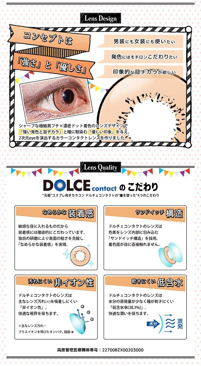 ハロウィン仮装にピッタリのドルチェストロングシリーズ♪ 7色展開のカラーバリエーションが様々な恰好で使えるこのシーズンの必需品! 濃密なドットデザインが瞳に馴染んで主張しすぎないリアリティのある妖艶な瞳を演出します。 《ブルーオーシャン》 深みのあるブルーと細フチが仮装にピッタリ! 《レッドファイア》 ピンク系レッドカラーでキツ過ぎない赤目に 《グリーンリーフ》 エメラルドグリーンのデザインが瞳を鮮やかに演出 《グリーンミスト》 ライトグリーンのしっとりとした発色がいつもと違う瞳を演出 《シルバースノウ》 ブルーのグラデーション+ホワイトでやりすぎないシルバーカラーに 《ゴールドサンダー》 煌くゴールドイエローが瞳を上品に仮装します 《パープルクリスタル》 水晶のようなピンクパープルがアニメのような瞳を演出