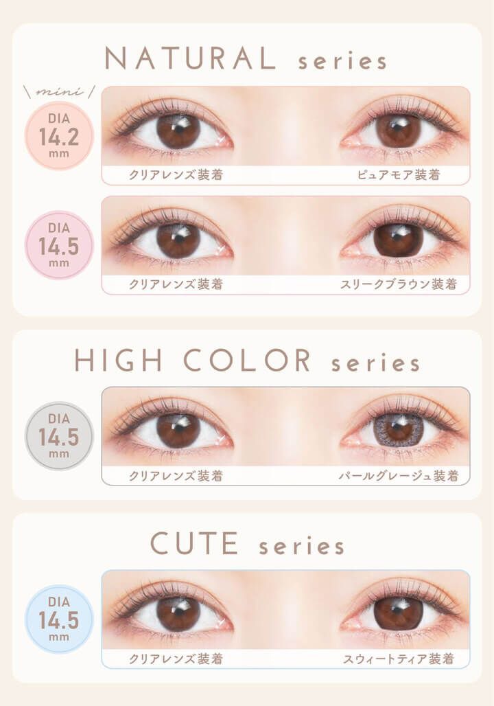 大人気エバーカラーの1ヶ月シリーズ『EYE GENIC』にDIA小さめサイズ登場!! ほんのりミルキーなこっそり垢抜けられるDIA14.2mm。 ナチュラル、キュート、ハイカラーの3タイプ全16カラー☆ 瞳の輝きを自由に楽しむことで、どんな瞬間も最高の自分に! イメージモデルは、女優やモデルとしても活躍中の新木優子ちゃん。 ■DIA14.2mm■ 《ピュアモア》 とろけるブラウンがピュア度MAXの瞳を演出 《ムーニーヌード》 ベージュとアッシュカラーがふんわり混ざり合ってエモい瞳に 《ディアベイビー》細フチ×ミルキーベージュでうるっとベイビーeye ■DIA14.5mm■ 《スリークブラウン》 なめらかで艶のある美しいベーシックブラウン 《シマーショコラ》 立体感ときらめきを放つオレンジブラウン 《スフレコーラル》 ほのかに色づくふんわりピンクブラウン 《スウィートティア》 ダークブラウンフチがちゅるんとした愛らしい雰囲気を演出。 《モダングランジ》 くっきり黒フチがエッジィでスタイリッシュな瞳を演出 《シャイニーリッチ》 光を取り込んだようなキラッと輝く華やかな印象に。 《パールグレージュ》 パールのように輝くクールで大人っぽグレー 《リュクスベージュ》 ヌーディーな発色ベージュがハーフ瞳を演出。 《セピアミスト》 2色の赤がナチュラルで繊細な輝きの瞳に。 《イノセントヘーゼル》 裸眼の色を引き立たせる、色素薄めな瞳に。 《スムースアーバン》 くすんだ輪郭が馴染み、大人かわいい瞳に。 《ココプラム》 プラムとブラウンのシアーな発色が瞳にふんわり溶け込む可愛い瞳 《ヘイジーウォーター》 透け感のあるグレーが淡くみずみずしいツヤのあるナチュラルハーフeye