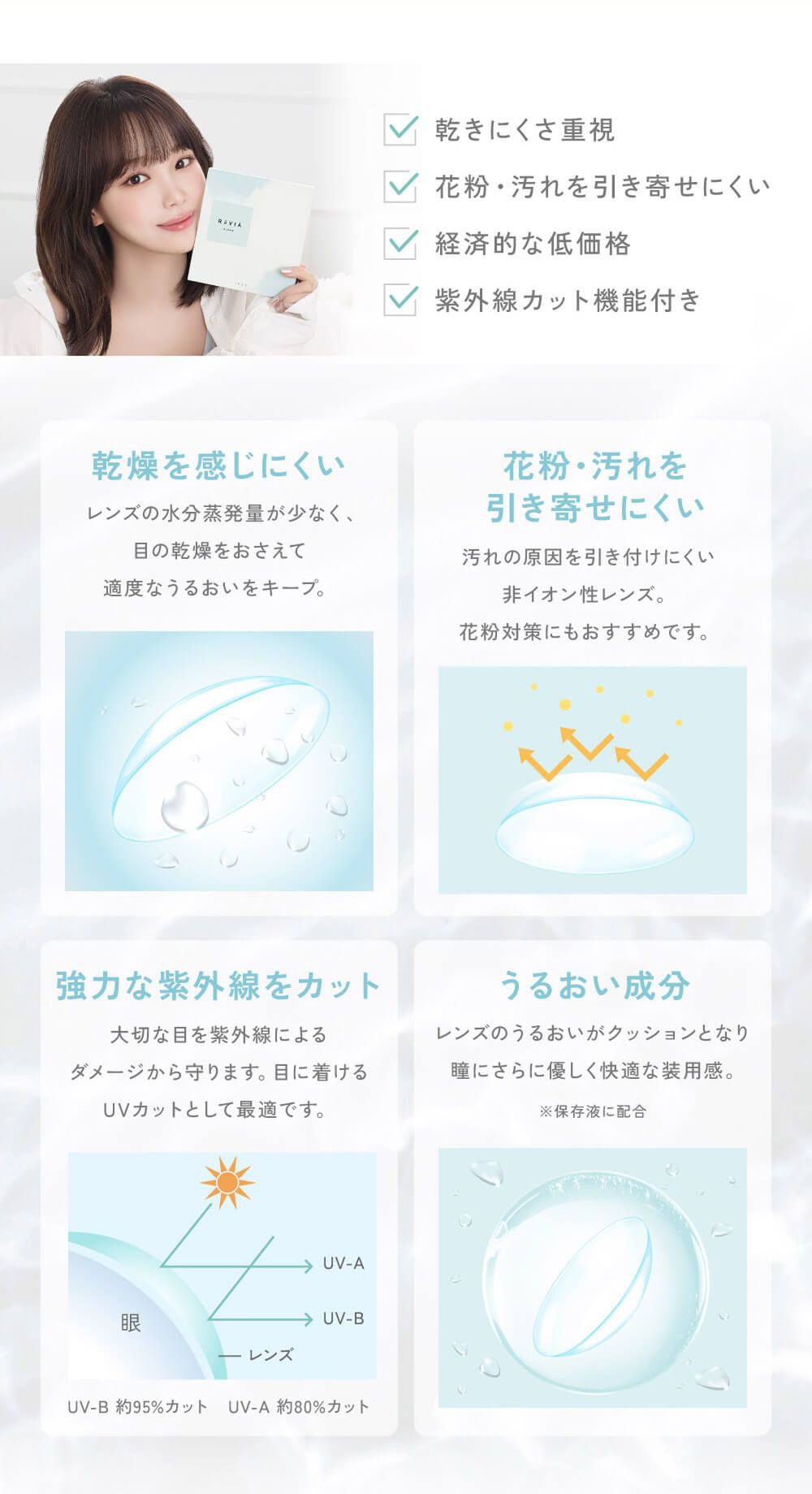 【低含水】うるおいバランス◎で目の渇きを感じにくくトータルバランスの良いレンズです!! 低含水レンズは蒸発が少ないため目の渇きを感じにくく、ドライアイの方にはとってもおすすめ♪ 花粉や汚れを引き寄せにくいため、毎日快適に装着していただけます☆【高含水】高含水レンズはうるおい重視、付け心地重視の方におすすめ♪嬉しいUVカット機能付き!!